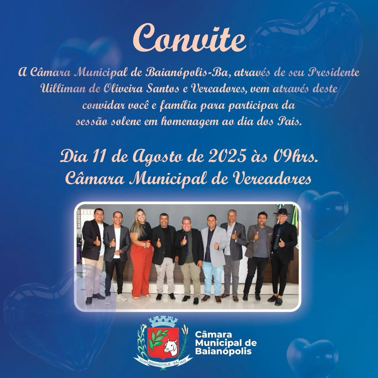 A Câmara Municipal de Baianópolis-BA, através de seu Presidente Ulilliman de Oliveira Santos e Vereadores, vem através deste convidar você e família para participar da sessão solene em homenagem ao dia dos Pais.