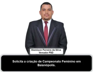 Vereador Diemison Ferreira solicita ao Prefeito Weube Febrônio a criação de Campeonato Feminino em Baianópolis